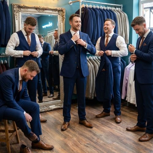 What to do: decide the groom’s suit direction first, then choose how the groomsmen will coordinate — matching, tonal, different waistcoats, or tie variations. If you’ve got a larger group, this is the best time to start getting everyone sized up.