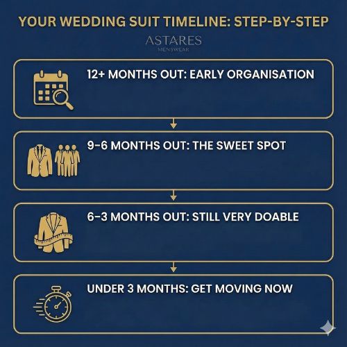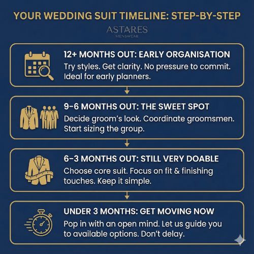 Most grooms don’t delay because they don’t care — it’s usually because they’re juggling everything else and the suit feels like something they’ll sort later.